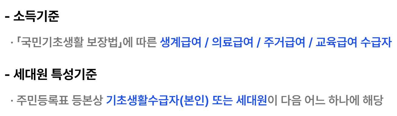 국민기초생활 보장법에 따른 생계급여 / 의료급여 / 주거급여 / 교육급여 수급자