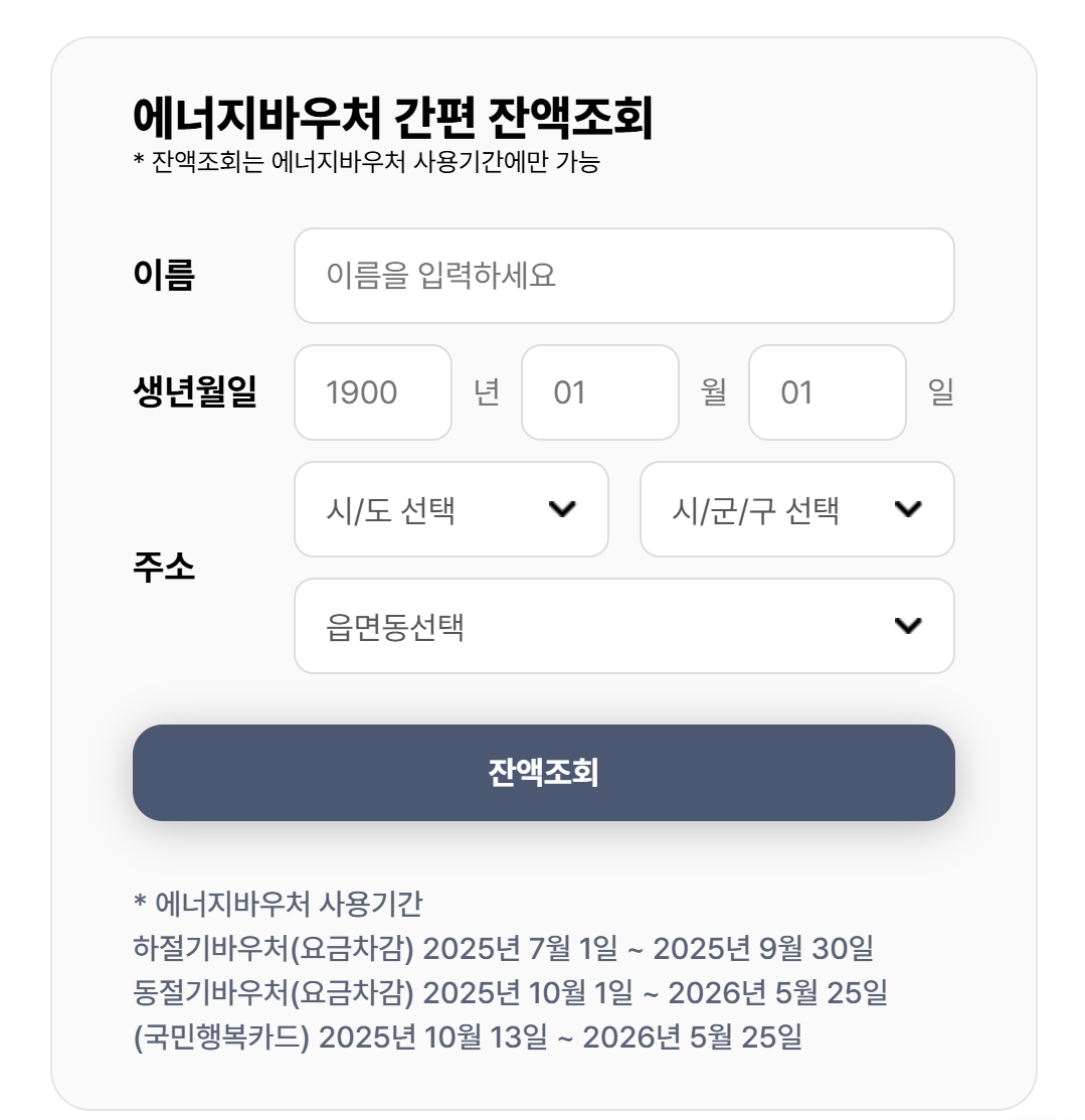 에너지 바우처 사용 기간에 한해 사용하고 남은 잔액 조회가 가능합니다.
