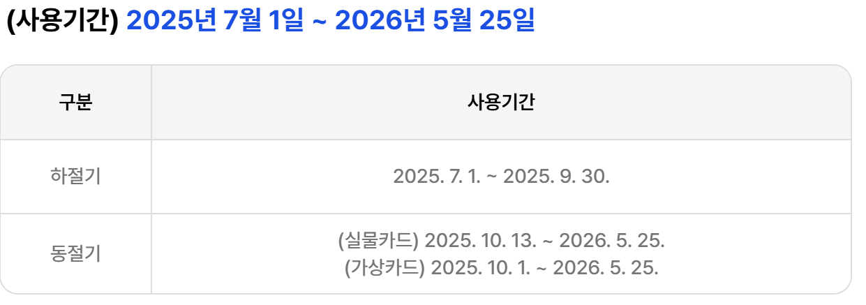 사용기간 (7월1일 ~ 9월 30일, 10월 1일 ~ 26년 5월 25일)을 참고해주세요.