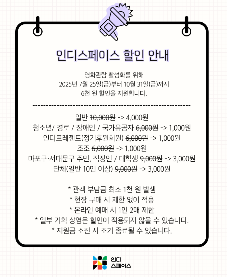예를 들어, 조조할인이나 기타 혜택으로 인해 기본 입장료가 6000원 이하인 경우에도, 할인권을 적용하면 0원 관람이 되는 것이 아니라 관객이 최소 1000원을 부담하게 되는 것이지요.