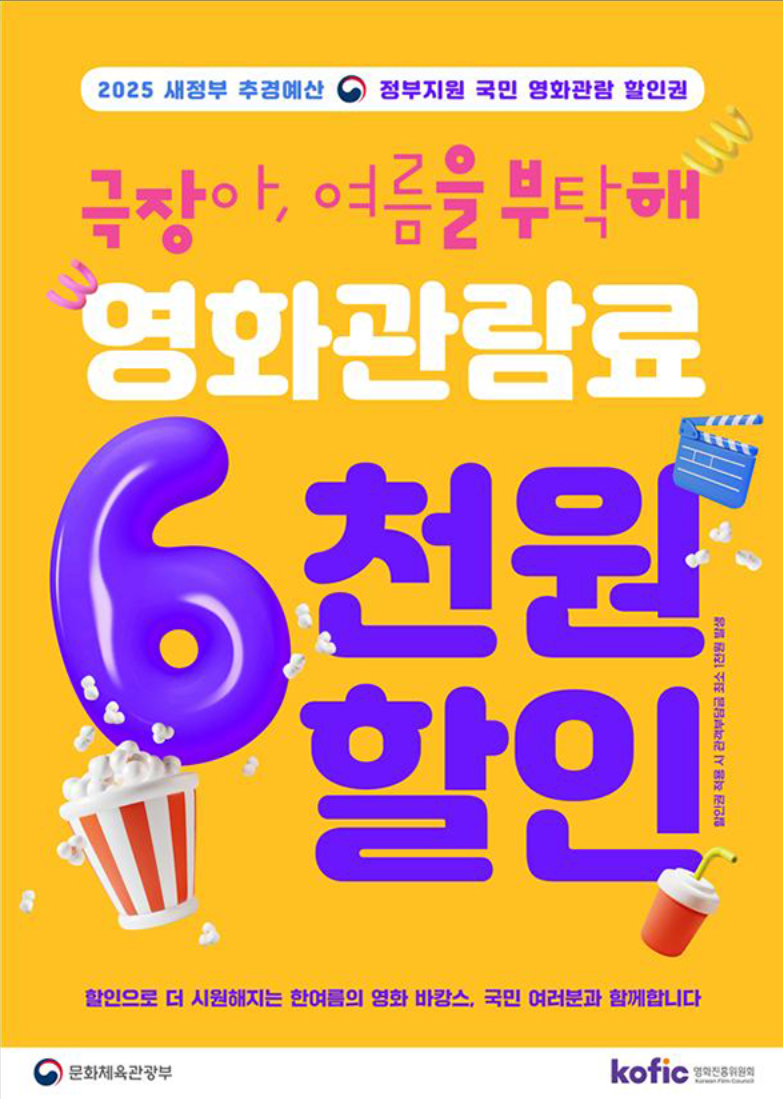 특히 매달 마지막 수요일에 진행되는 ‘문화가 있는 날’ 혜택과도 중복 적용이 가능한데요, 오는 7월 30일 ‘문화가 있는 날’에 영화관을 찾는다면, 기존 ‘문화가 있는 날’ 가격인 7000원에서 추가로 정부가 지원하는 6000원 할인이 더해져 단 1000원에 영화를 관람할 수 있게 됩니다.
