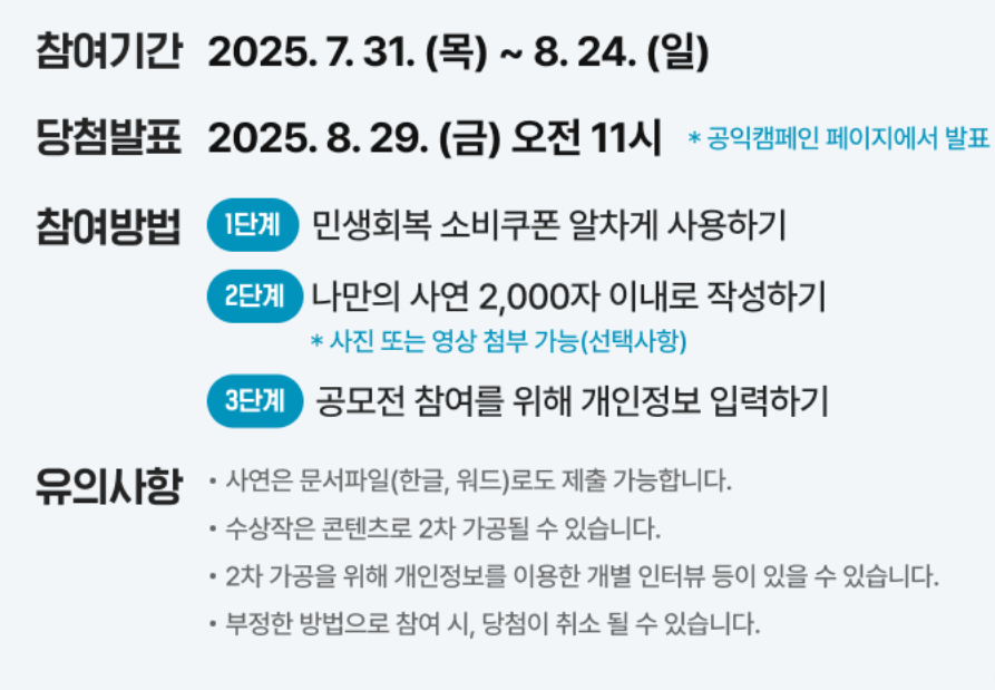 바로 민생회복 소비쿠폰 사연 공모전이 7월 31일부터 8월 24일까지 약 3주 동안 진행되는데요, 소비쿠폰을 통해 경험한 따뜻하고 가치 있는 사연을 발굴하고, 이를 널리 공유해 지역 경제의 활력이 계속 이어지길 바라는 취지에서 마련되었습니다.