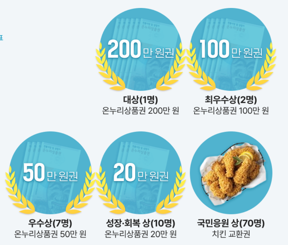 이번 사연 공모전에는 총 1000만 원 상당의 푸짐한 경품이 준비되어 있습니다. 내부 심사를 통해 총 90명을 선정하며, 대상 1명에게는 무려 200만 원 상당의 온누리상품권이 수여됩니다. 이어서 최우수상 2명에게는 온누리상품권 100만 원권, 우수상 7명에게는 50만 원권, 성장·회복상 10명에게는 20만 원권, 그리고 국민응원상 70명에게는 치킨 교환권이 제공됩니다. 소중한 사연을 통해 이웃과 지역사회의 변화를 함께 나누면서, 푸짐한 선물까지 받을 수 있는 좋은 기회이니 놓치지 마세요.
