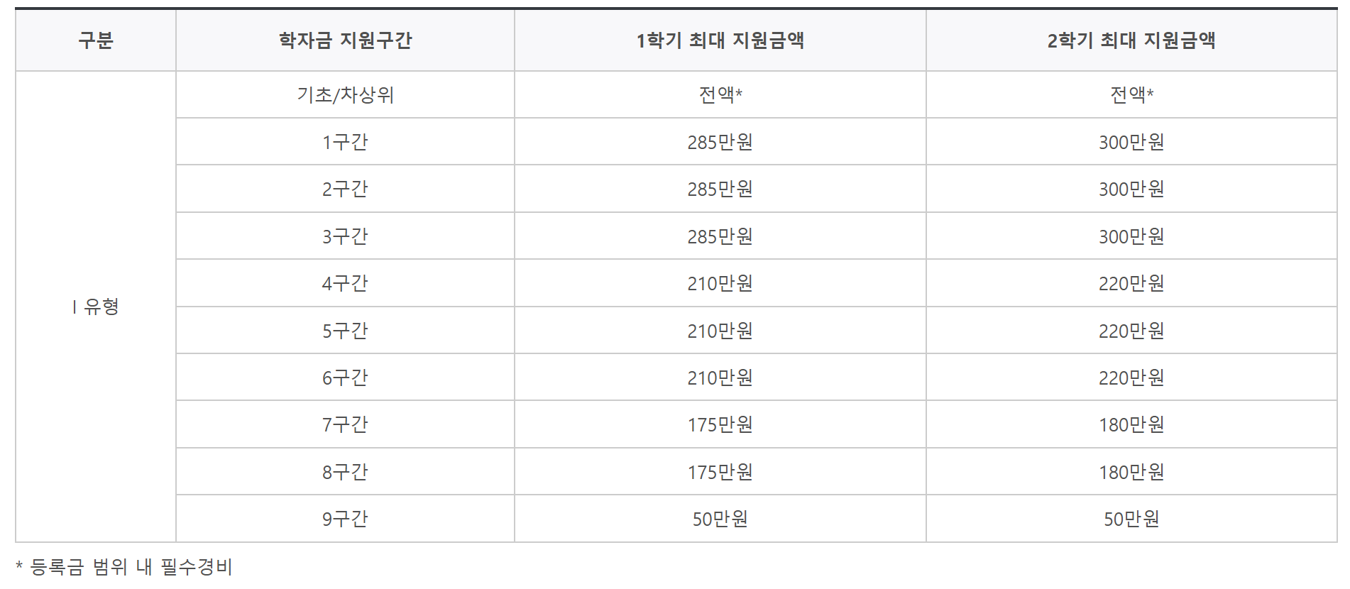 국가장학금 2차 소득분위별 지원 금액